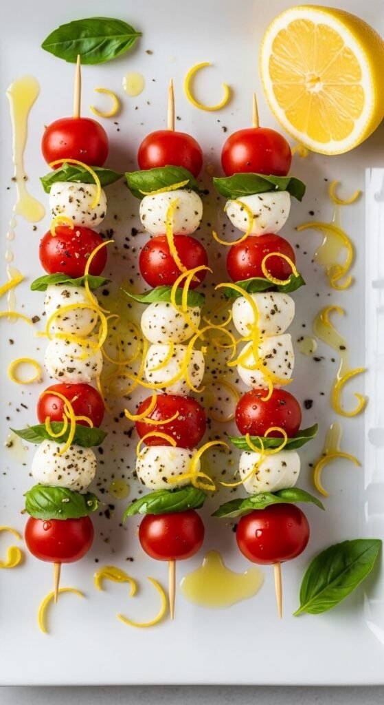 Lemon zest brings a citrusy brightness that cuts through the richness of the mozzarella. Assemble skewers as usual, then use a fine grater to zest a lemon directly over the top right before serving. Drizzle with good olive oil. Don’t use bottled lemon juice — it’s too sharp and watery. The zest gives flavor without moisture. A single lemon costs under $1 and adds a totally different dimension to an otherwise familiar dish. Simple and smart for spring events or outdoor lunches.