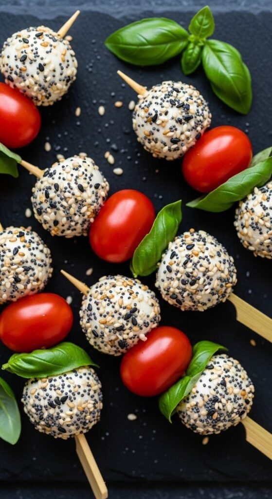 This sounds unexpected, but it works. Roll each mozzarella ball in everything bagel seasoning before threading. The seeds and dried onion stick right to the surface of the cheese. You get a crunchy, savory coating that completely changes the texture of each bite. Everything bagel seasoning is widely available at most grocery stores for about $3–4 a jar. No other dressing needed. These are a conversation starter — guests will ask what they are before they even taste them. Fun, cheap, and genuinely delicious.