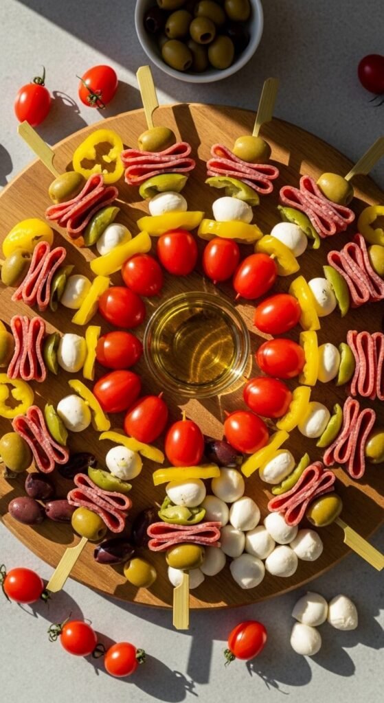 Go bigger by turning your skewers into mini antipasto platters on a stick. Thread salami folds, mozzarella, cherry tomatoes, a sliced banana pepper ring, and an olive all on one long skewer. The key is variety on each pick. Buy a mixed antipasto pack — usually under $6 at most stores — and you’ll have everything you need. These are filling enough to replace a full charcuterie board for smaller gatherings. Serve with a side of marinara or spicy mustard for dipping. Everyone loves them.