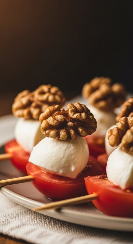 Add a small candied walnut piece to the top of each skewer for a sweet crunch. You can make a quick batch by tossing walnut halves in a little sugar and butter in a pan for 5 minutes. Let them cool on parchment before using. Store-bought candied nuts work just as well and save time. The sweet-salty-creamy combination is addictive. These skewers lean a little more fancy, making them great for dinner party appetizers or holiday spreads where you want something that feels slightly elevated without much extra cost or effort.