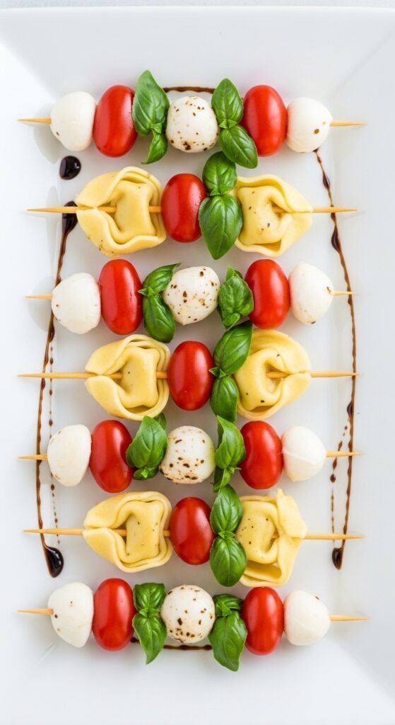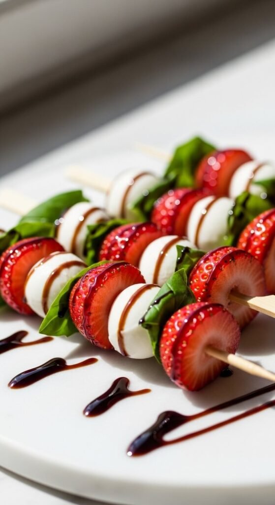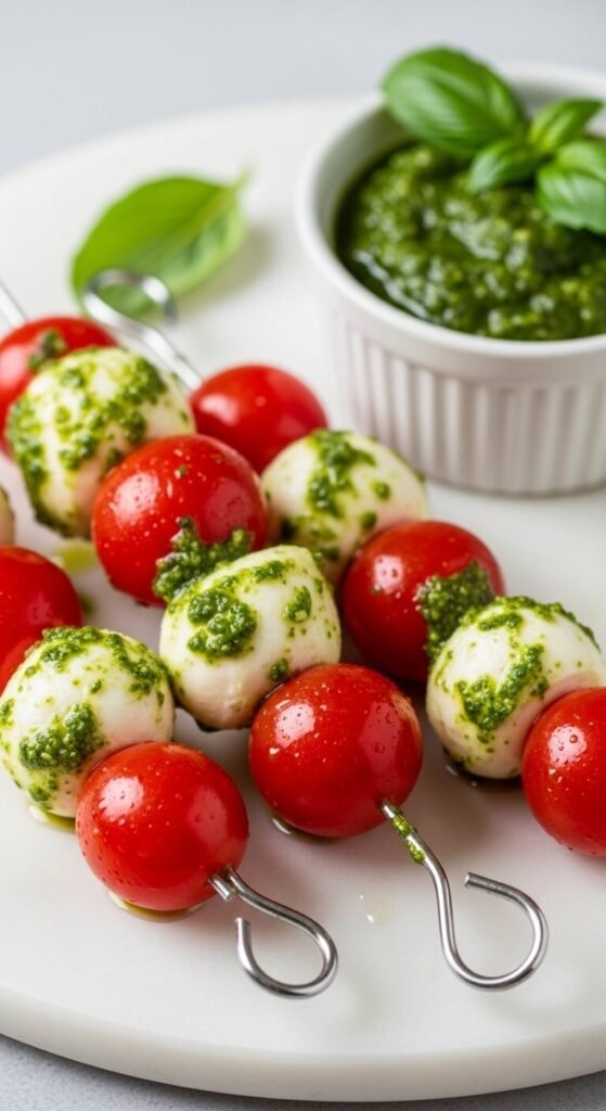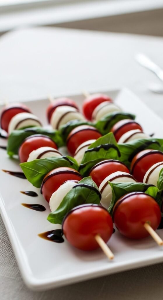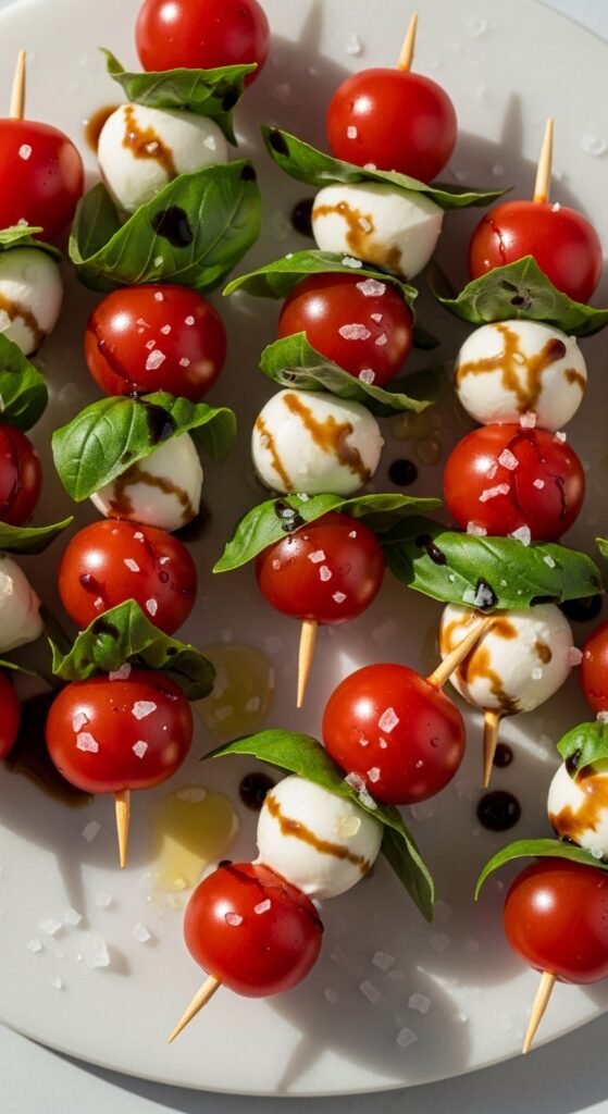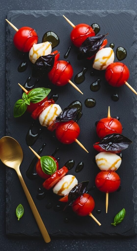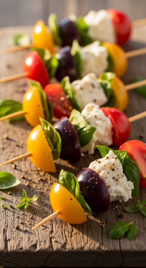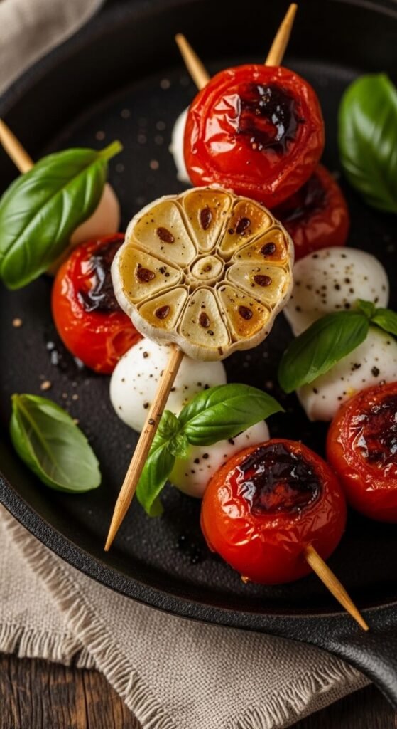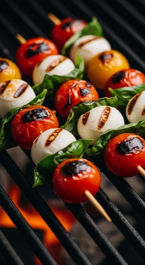 Yes — you can grill these. Assemble skewers on metal skewers (not bamboo, which burns) and brush lightly with olive oil. Grill over medium heat for 2–3 minutes per side. The tomatoes blister and sweeten, the mozzarella softens slightly, and everything gets a subtle smoky flavor. Don’t overcook — you want the cheese warm, not completely melted. These work beautifully as a barbecue appetizer and take almost no prep. Serve immediately off the grill with a drizzle of balsamic and a pinch of sea salt.