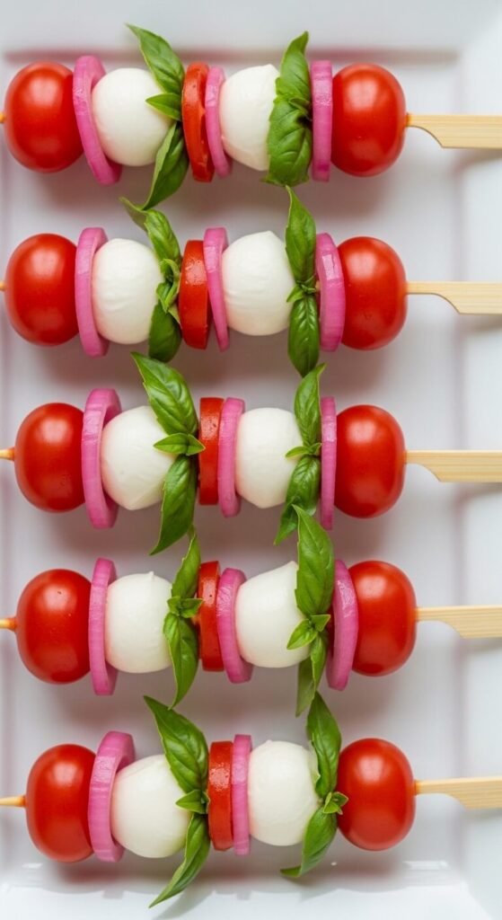 Pickled red onions add tang and a gorgeous pink color to an otherwise familiar-looking skewer. Quick-pickle them by soaking thin sliced red onion in red wine vinegar, salt, and a pinch of sugar for 30 minutes. They keep in the fridge for up to two weeks, so make a batch and use them all week. Thread a small ring of pickled onion between the tomato and mozzarella on each skewer. The acidity balances the creamy cheese perfectly. A great way to add complexity without spending anything extra.