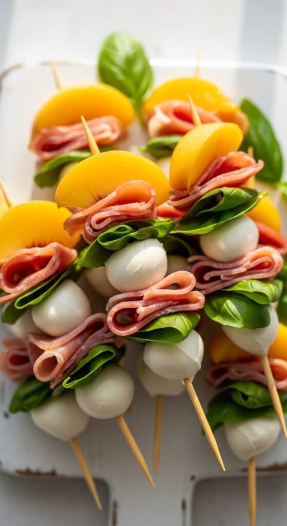 Peach season is peak time for this one. Use a firm, ripe peach — cut into chunks that hold on a skewer. Wrap each chunk in a thin strip of prosciutto before threading, then add mozzarella and basil. Sweet, salty, creamy, herby — every element is doing something. This combination screams summer. A single peach makes enough pieces for a full platter of skewers, keeping the cost minimal. Drizzle with a little honey instead of balsamic to keep the fruit-forward character front and center.