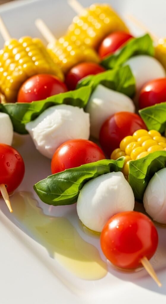This one celebrates peak summer produce. Cook a fresh ear of corn and cut it into thick rounds — about 1 inch — or use the individual kernels threaded in clusters. The corn adds sweetness and a satisfying chew alongside the soft mozzarella. Fresh corn is cheapest in summer at about $0.50 per ear. Thread with cherry tomatoes and basil. A light drizzle of chili-lime butter on top makes this feel like a Mexican-Italian hybrid that guests won’t stop talking about. Fun, seasonal, and budget-friendly.