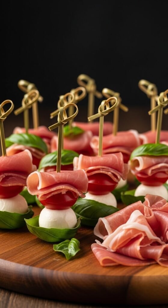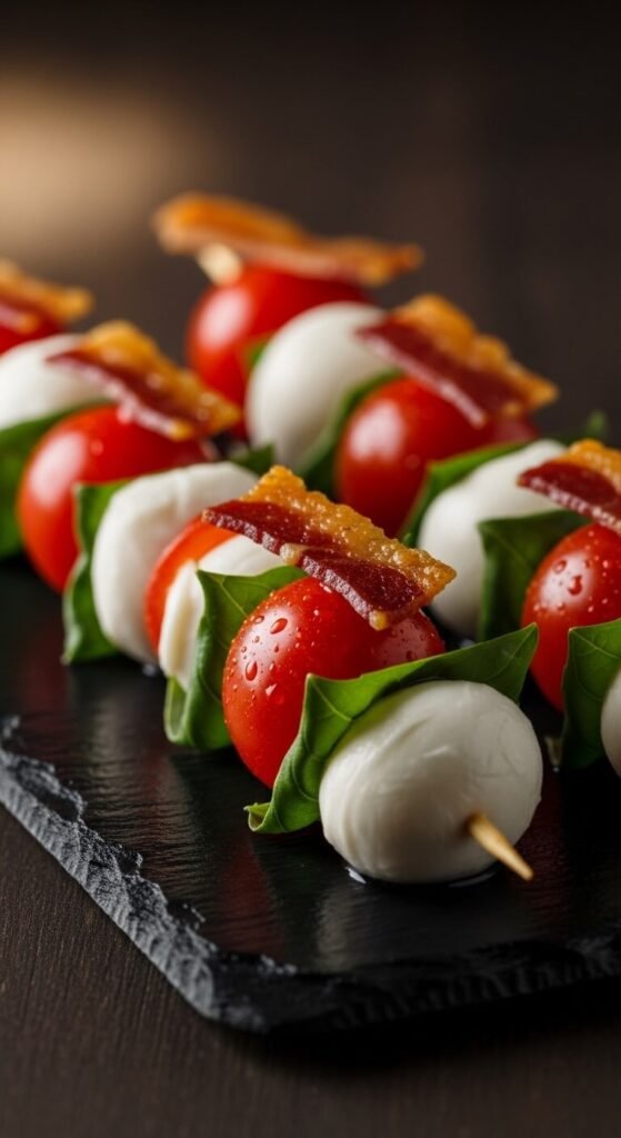 Crispy pancetta adds crunch and deep salty flavor. Dice a few pancetta slices and cook in a dry skillet until golden and crispy. Let them cool on paper towels. Sprinkle or rest a piece on top of each skewer right before serving — don’t add earlier or it’ll soften. Pancetta is available pre-diced in small packages at most grocery stores for around $3–4. This version pairs well with a dark balsamic reduction. It’s rich and satisfying — a great choice when you want your appetizer to feel a little more indulgent.