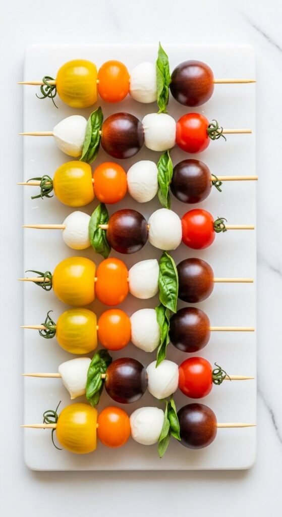 This one is all about the visual payoff. Use a mix of yellow pear tomatoes, orange baby tomatoes, red cherry tomatoes, and purple heirloom grape tomatoes all on one skewer. Alternate colors intentionally so each skewer looks like a rainbow. Look for mixed packs at farmers markets or in the specialty produce section — usually $3–5. The flavor difference between varieties is minimal, but the color impact on a platter is dramatic. These are the skewers people photograph before they eat. Perfect for parties, events, or any time you want the table to look stunning.