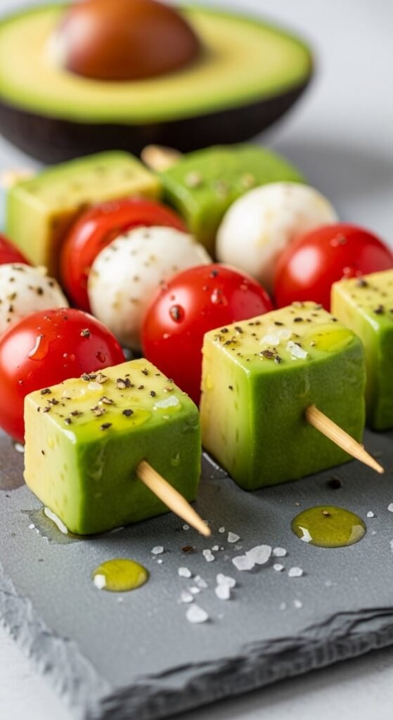 Avocado adds richness and a creamy texture that pairs naturally with tomato and cheese. Cut a firm (not overripe) avocado into chunks that won’t fall apart on the skewer. Thread in between the tomato and mozzarella. Use avocado the same day — it browns quickly once cut. A squeeze of lime juice helps slow that down if you’re prepping ahead. Finish with flaky sea salt and a drizzle of good olive oil. Simple, satisfying, and a crowd-pleaser for guacamole fans.