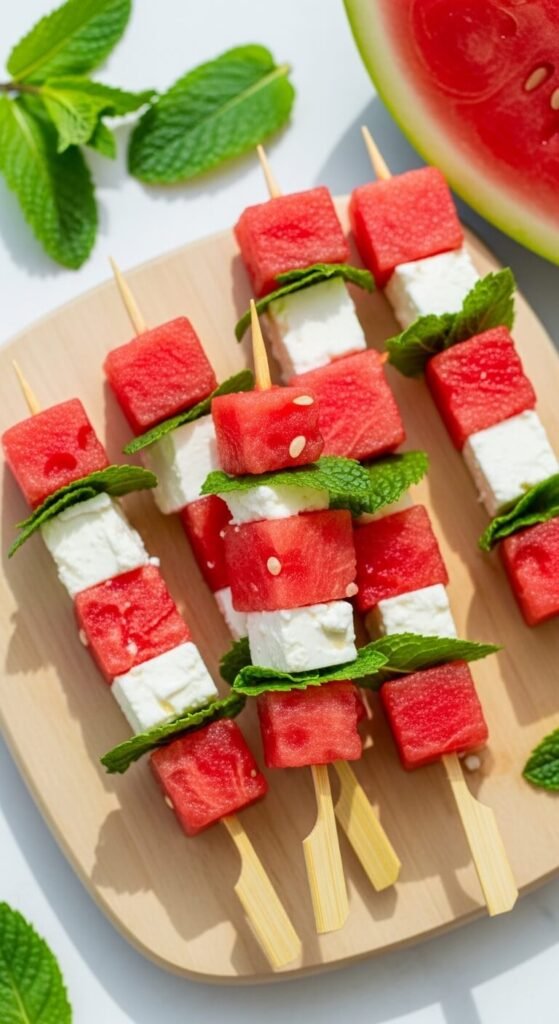 Not every caprese skewer needs to follow the traditional template. This version swaps mozzarella for feta and basil for mint — and the result is stunning. Cut seedless watermelon into 1-inch cubes. Thread with a crumbled chunk of feta and a fresh mint leaf. Keep these chilled until serving — they’re best cold. Feta is usually around $3–4 for a block at most stores. This is a refreshing option for summer parties and pairs beautifully with rosé or sparkling water with lime.