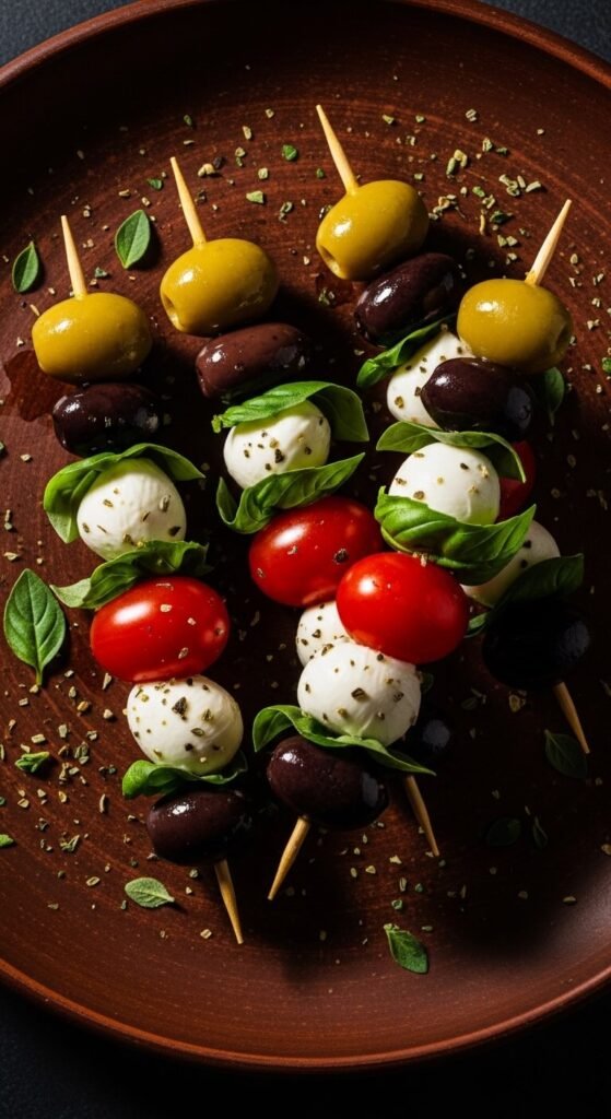 Adding olives gives these skewers a briny, Mediterranean quality that pairs well with the mild mozzarella. Use large pitted Kalamata or Castelvetrano olives — both available at most grocery stores for about $3–4 a jar. Thread one olive per skewer between the tomato and cheese. Castelvetrano olives are milder and buttery, making them a better pick if you’re serving guests who aren’t big olive fans. Drizzle with herby olive oil and serve alongside pita or crackers to make it a fuller spread.