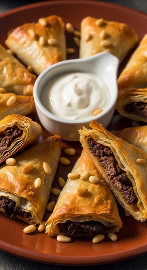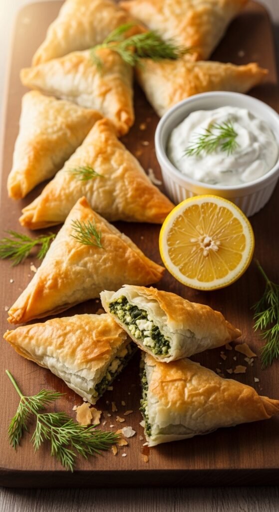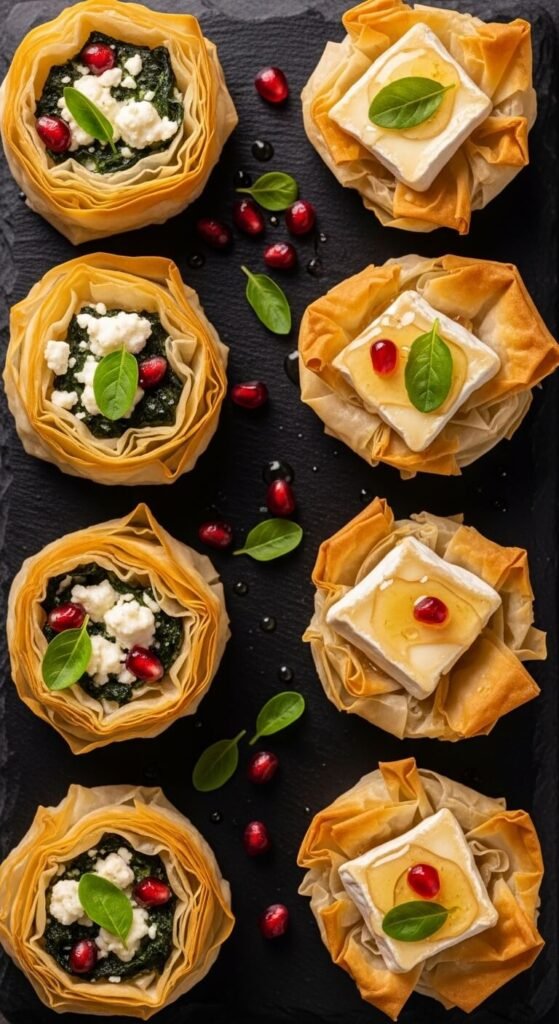 These are the gold standard of phyllo appetizers. Spinach and feta packed inside a buttery triangle — simple, satisfying, and always gone first. Use frozen spinach to cut costs. Squeeze it dry before mixing with crumbled feta, a beaten egg, and a pinch of nutmeg. Brush each phyllo layer with melted butter, fold into triangles, and bake at 375°F until deeply golden. Make a big batch and freeze them unbaked. Pop them straight into the oven from frozen — no thawing needed.