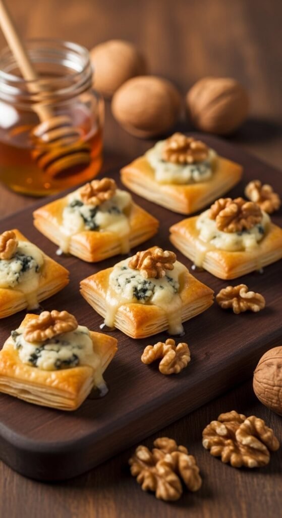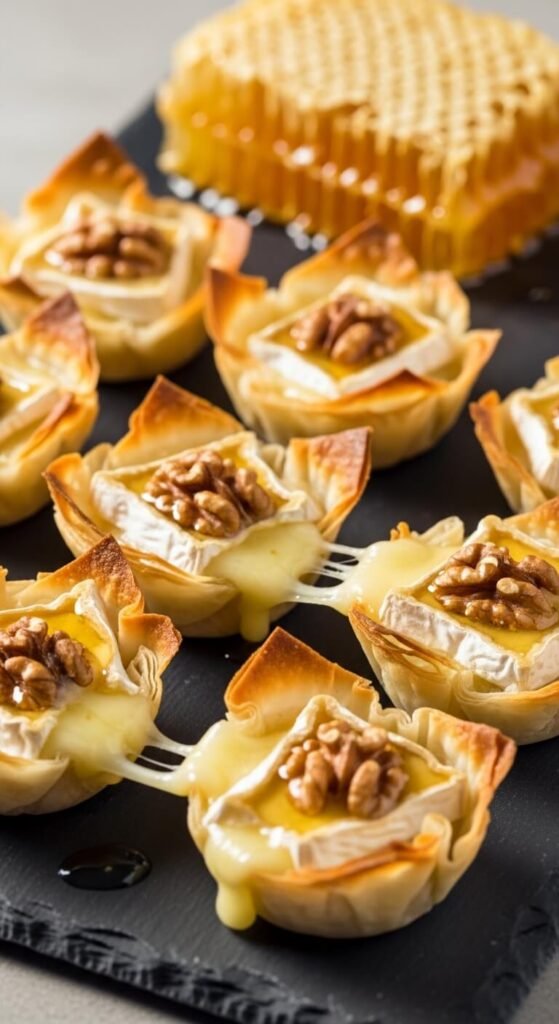 Bold, pungent blue cheese mellows beautifully when baked inside crisp phyllo. Mix crumbled blue cheese with softened cream cheese (to tame the intensity) and roughly chopped toasted walnuts. Place a small mound on buttered phyllo squares and bake until golden. Drizzle with honey right before serving — the sweet-salty contrast is addictive. Buy blue cheese in bulk from a wheel at the deli counter — it’s often half the price of pre-packaged crumbles and tastes far better.