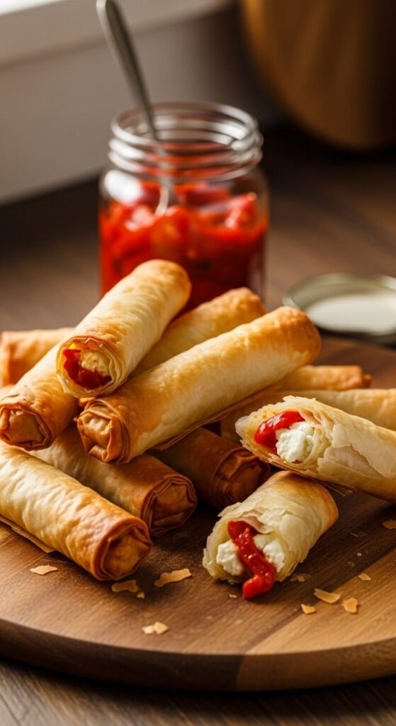 Jarred roasted red peppers are a pantry staple that punches above their price. Drain and chop them finely, then mix with crumbled feta, a little garlic, and dried oregano. Roll the filling in thin strips of buttered phyllo into tight cylinders. Seal the edge with butter and bake at 375°F until crisp and golden. These hold their shape well and travel nicely to potlucks. Make them a day ahead and reheat in the oven for 5 minutes — they crisp right back up.