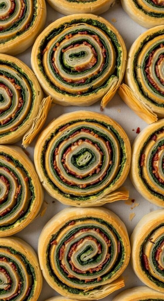 These are crowd-pleasers that work for any occasion. Cook chopped bacon until crisp, then set aside. Wilt fresh spinach in the bacon fat (don’t waste it), drain well, and chop finely. Mix with cream cheese, the bacon, and shredded cheddar. Spread evenly over a large rectangle of buttered phyllo layers. Roll tightly into a log, refrigerate for 30 minutes, then slice into rounds and bake at 375°F until golden. Refrigerating first helps the slices hold their swirl shape during baking.