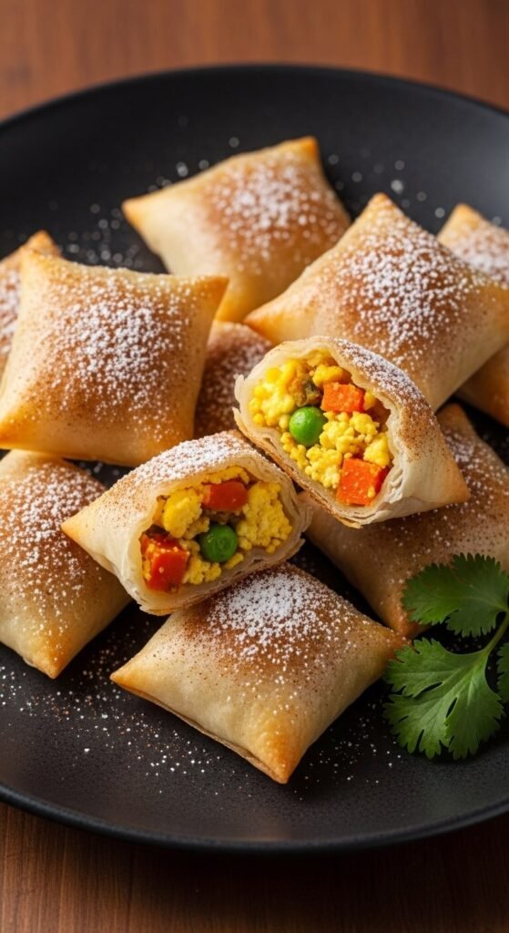 Bastilla is a traditional Moroccan pie with sweet-savory spiced filling. Make a simplified version by sautéing onion, carrot, and chickpeas with cumin, coriander, cinnamon, and turmeric. Scramble in two eggs until just set. Let cool. Fill small phyllo squares, fold into parcels, and bake at 375°F. Dust with a little cinnamon and powdered sugar before serving — this is the traditional finishing touch that makes them taste completely unique. The spices are pantry staples and the whole recipe costs very little.