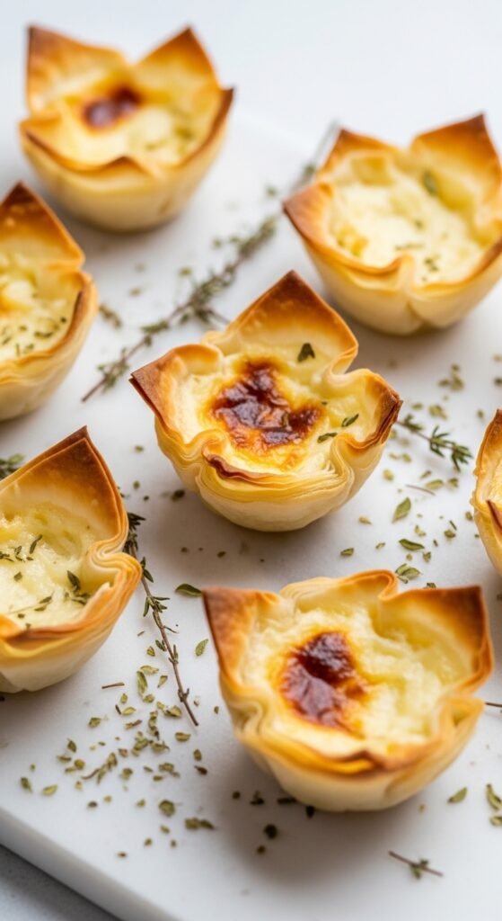 Sweet and savory together — this combination never fails at a party. Press small rounds of buttered phyllo layers into a mini muffin tin to form shells. Bake until golden, then fill each with a small chunk of brie. Return to the oven for 3–4 minutes until the cheese melts. Top with a walnut piece and a drizzle of honey right before serving. Don’t add the honey too early or it makes the pastry soggy. These feel indulgent but cost very little per piece.
