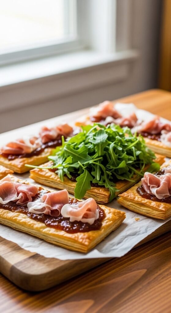 This last one is the showstopper. Bake large rectangles of well-buttered phyllo until deeply golden and completely crisp. Cool on a rack. Spread with fig jam, lay a thin fold of prosciutto on top, and add a small handful of arugula tossed in lemon juice and olive oil. Serve immediately so the pastry stays crisp. Prosciutto is pricey but you only need a few slices across the whole tray. A small jar of fig jam is under $5 and covers a full batch of crisps with ease.