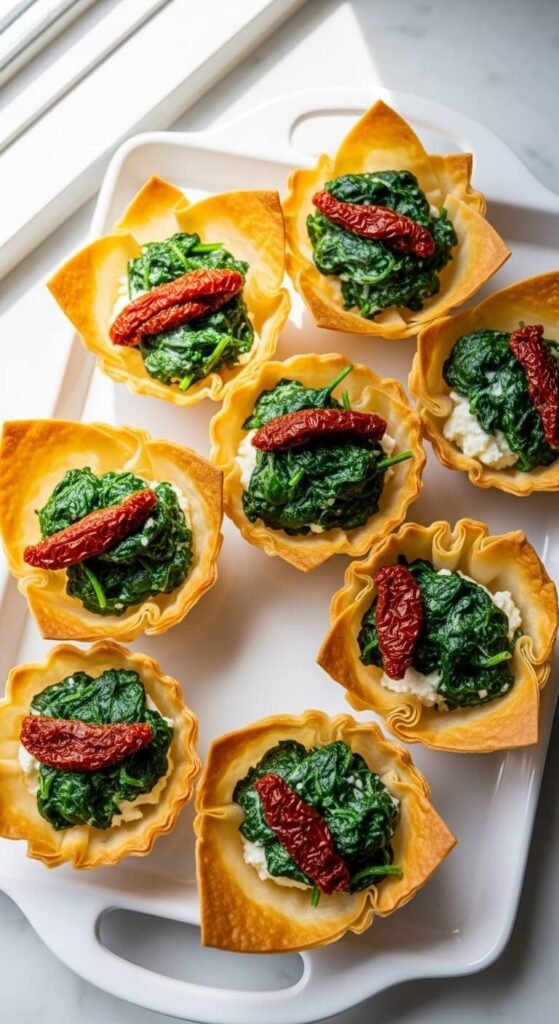 Ricotta makes a creamy, mild base that lets the other flavors shine. Mix ricotta with sautéed spinach (well-drained), chopped sun-dried tomatoes, a beaten egg, and salt. Spoon into pre-baked phyllo cups and bake at 350°F until the filling is set and lightly golden on top. Sun-dried tomatoes in a jar packed in oil are shelf-stable and affordable. The oil they come in is flavorful too — use it to brush over the phyllo instead of plain butter for extra depth.