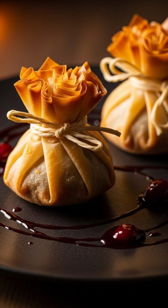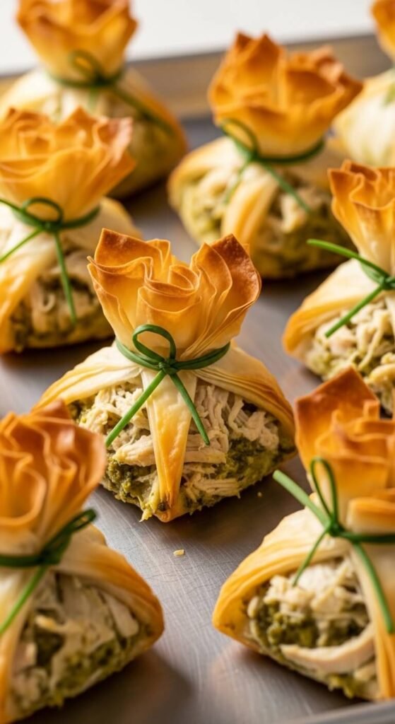 Rotisserie chicken makes this incredibly easy. Shred the meat and mix with store-bought basil pesto and a spoonful of cream cheese. Place a mound of filling in the center of a buttered phyllo square. Gather the corners up and twist to form a little parcel. Brush the top with butter and bake until golden. These look elegant but take about 20 minutes to assemble. One rotisserie chicken gives you enough filling for 12–15 parcels easily.