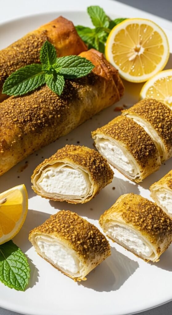 Za’atar is a Middle Eastern spice blend of thyme, sumac, and sesame — earthy, tangy, and aromatic. Mix it with labneh (strained yogurt cheese) and a drizzle of olive oil. Spread onto buttered phyllo strips and roll into tight cylinders. Brush the outside with olive oil mixed with extra za’atar. Bake at 375°F until crisp. Labneh is sold at Middle Eastern grocery stores at a very low price. If you can’t find it, plain Greek yogurt strained overnight in a cheesecloth works just as well.
