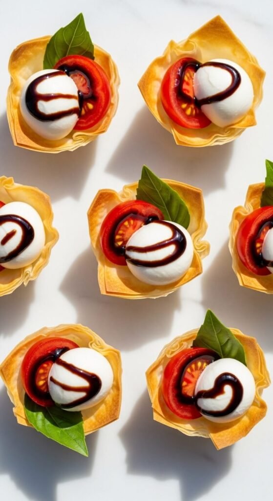 The classic caprese combination — tomato, mozzarella, basil — works beautifully inside a crisp phyllo shell. Bake small phyllo cups until golden and cool completely. Fill each with a torn piece of fresh mozzarella and a halved cherry tomato. Top with a basil leaf and a tiny drizzle of balsamic glaze. Balsamic glaze from a bottle is cheap and lasts forever. Assemble these right before serving so the shells stay crisp. Use ciliegine (small mozzarella balls) — they’re the perfect size for phyllo cups.