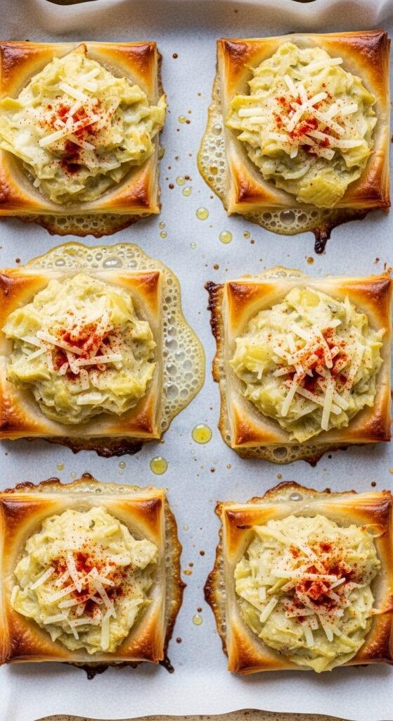 This is basically artichoke dip — baked on top of crispy phyllo. Mix canned artichoke hearts (drained and chopped) with cream cheese, grated parmesan, garlic, and a pinch of red pepper flakes. Layer and butter four phyllo sheets, cut into squares, and spoon filling on each. Bake at 375°F until the phyllo is golden and the topping is set. Canned artichokes keep the cost low while delivering a rich, savory flavor. These work as finger food or a light starter.