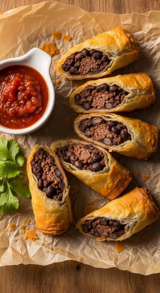 This gives you the flavors of an empanada with the crunch of phyllo. Brown ground beef with onion, garlic, cumin, and chili powder. Stir in drained black beans and a spoonful of salsa. Let cool. Spread onto buttered phyllo strips and roll into logs. Bake at 375°F until golden. Slice on the diagonal and serve with sour cream or salsa. Ground beef is one of the most affordable proteins. A half pound of meat fills about 10–12 rolls — plenty for a party platter.
