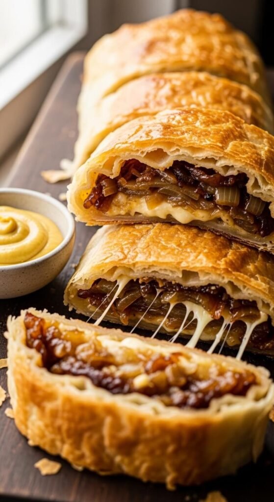 Low and slow is the key to caramelized onions. Cook sliced yellow onions in butter over medium-low heat for 30–40 minutes until they turn deep amber and sweet. Let them cool. Mix with shredded gruyère and a teaspoon of Dijon mustard. Spread the filling over buttered phyllo sheets, roll into a log, and bake at 375°F. Slice into rounds before serving. Swap gruyère for Swiss if budget is tight — the flavor is close and the price is lower.
