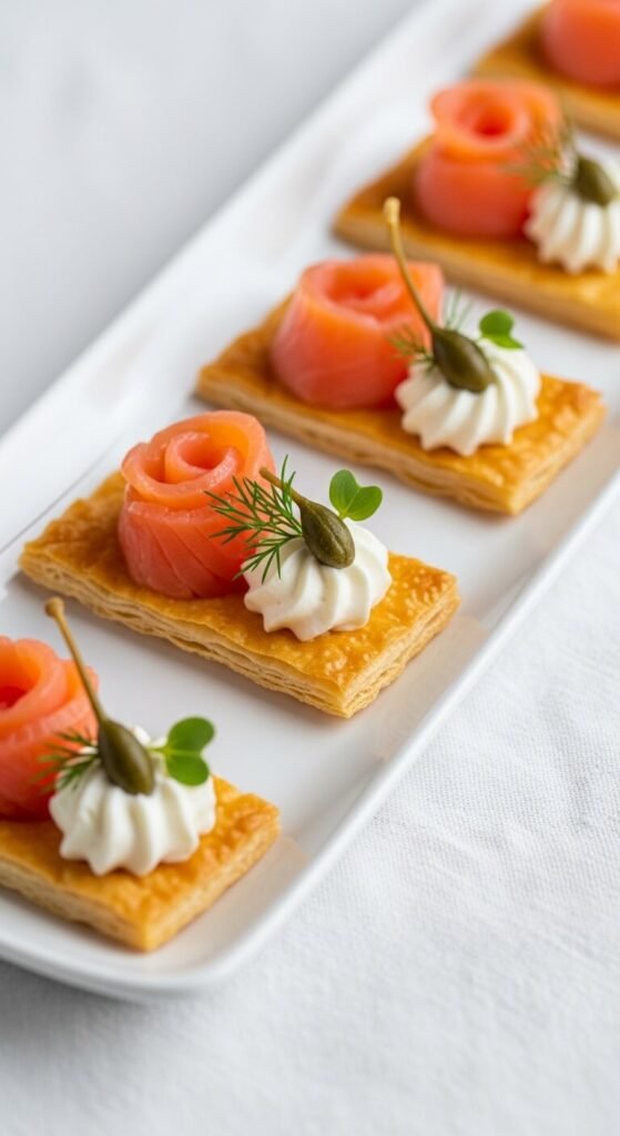 Bake small rectangles of layered, buttered phyllo until golden and crisp. Let them cool completely — they need to be sturdy enough to hold toppings. Spread with whipped cream cheese, then top with a fold of smoked salmon. Add a caper and a tiny sprig of dill. That’s the whole recipe. Buy smoked salmon ends or trimmings instead of the pretty sliced kind — they cost half as much and taste identical once assembled. Great for brunch parties or holiday spreads.