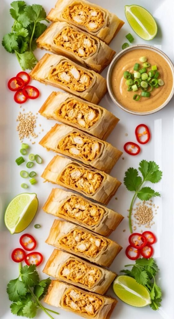 This unexpected flavor combination wins over every crowd. Mix shredded cooked chicken with peanut butter, soy sauce, rice vinegar, sesame oil, and a pinch of chili flakes. The sauce should be thick and clingy. Roll the filling in buttered phyllo strips and bake until golden and crisp. Serve with extra peanut sauce for dipping. Rotisserie chicken works great here — one bird gives you enough filling for a full tray. This recipe also works well as a make-ahead appetizer that reheats perfectly.