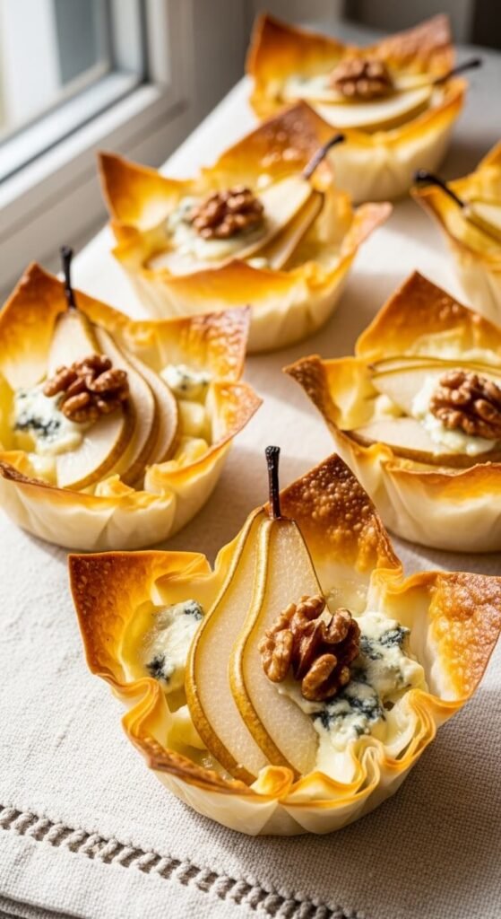 Sweet fruit and salty cheese inside crisp pastry — this combination belongs at every dinner party. Slice a ripe pear thinly and arrange a few pieces in each pre-baked phyllo cup. Add a small crumble of gorgonzola. Return to a 350°F oven for 5 minutes until the cheese softens. Top with a candied walnut. Slightly underripe pears hold their shape better when baked. Gorgonzola is a little pricier, but you only need a small amount per bite — one wedge goes a long way.