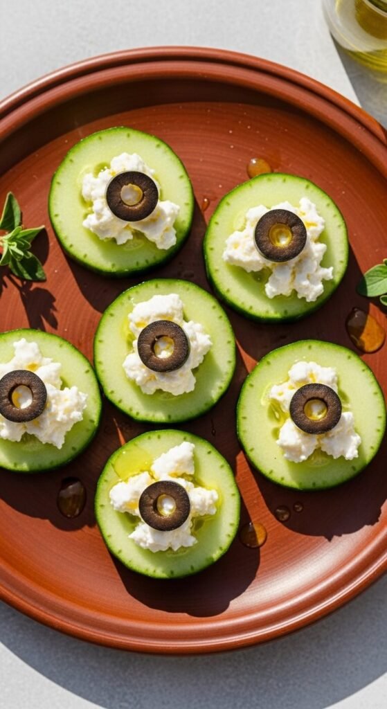 Think of this as a mini Greek salad on a cucumber. Top each round with crumbled feta, a black olive slice, and a tiny drizzle of olive oil. Sprinkle dried oregano if you have it. The flavors are sharp and satisfying. Feta is affordable and sold in blocks or pre-crumbled. These take under 10 minutes to assemble. Serve them cold. They pair well with hummus on the same board.
