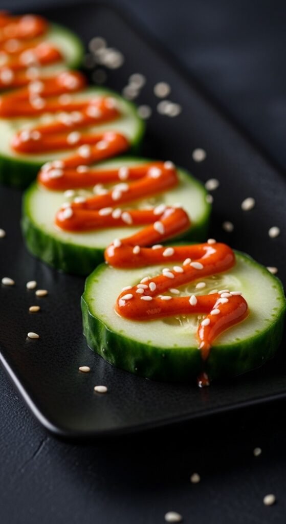 Mix cream cheese with a good squeeze of sriracha. Spread it on cucumber slices. Top with sesame seeds. That’s it. The heat balances the cool crunch in a really satisfying way. Adjust the sriracha depending on your crowd. Make a mild version and a spicy one so guests can choose. This is a five-minute appetizer that disappears fast. Serve on a dark plate to make the colors pop.