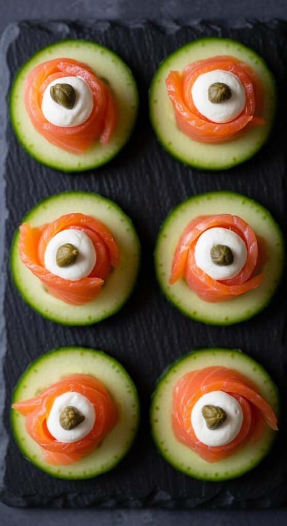 Crumble a small piece of blue cheese onto each cucumber slice. Press half a walnut piece into the cheese. Add a tiny drop of honey if you want to cut the sharpness. Blue cheese is strong, so a little goes a long way. This is a great option for cheese lovers who want something more bold. Serve on a dark board to contrast the colors. Works well at wine-tasting events or adult dinner parties.