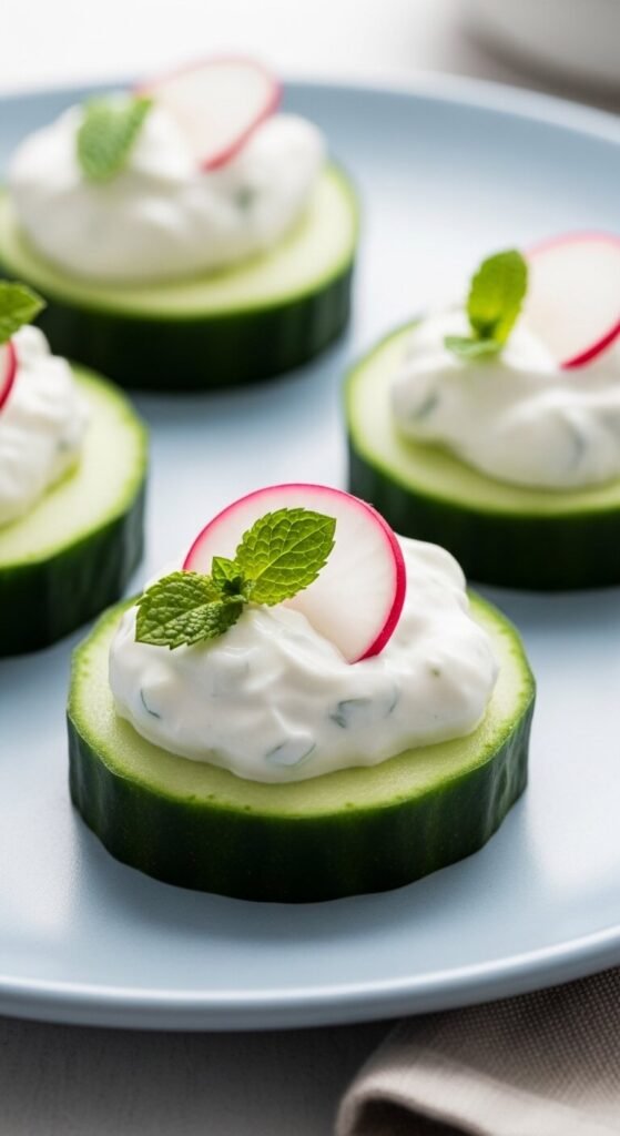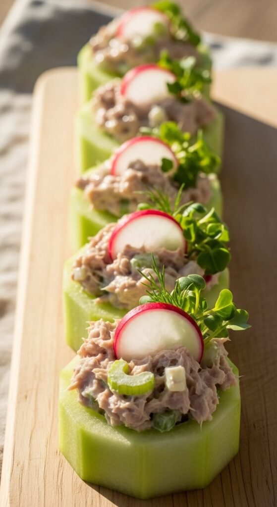 Take a thick cucumber section and scoop out the center with a melon baller or spoon. Fill it with your favorite tuna salad. Canned tuna works perfectly here. Mix with mayo, mustard, a little celery, and lemon juice. These hold their shape well and are easy to eat in one or two bites. Great for meal-prep appetizer trays. Kids enjoy them too. Budget-friendly and protein-packed.