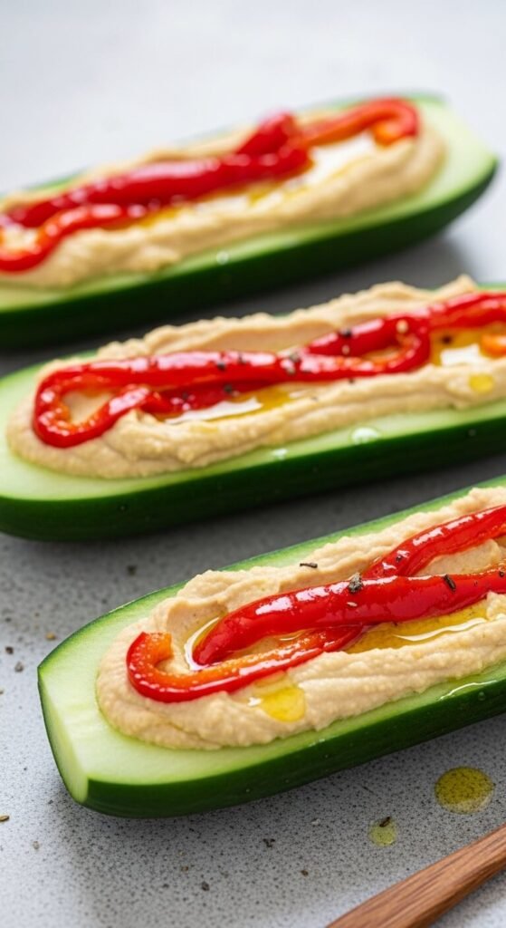 Slice cucumbers in half lengthwise. Scoop out the seeds to create a natural boat shape. Fill with hummus. Layer strips of jarred roasted red pepper on top. Drizzle olive oil and add a pinch of smoked paprika. Store-bought hummus works great here. These are filling enough to count as a light snack and look great on a platter. Easy to customize with different hummus flavors.