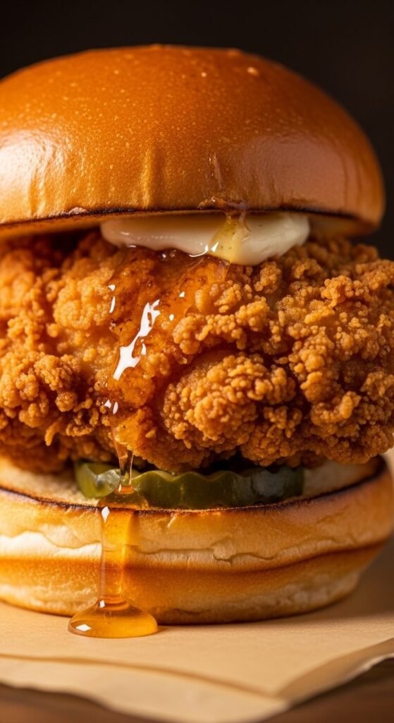 Crispy fried chicken + honey butter = instant obsession. Pound boneless chicken thighs thin, dredge in seasoned flour, and fry until golden. Drizzle with a mix of melted butter and honey while still hot. Add one pickle slice. Put it on a toasted potato bun. That is it. No complicated sauces or toppings needed. The honey butter soaks into the crust for a sweet-salty flavor that is hard to beat. Chicken thighs cost less than breasts and stay juicier through frying.