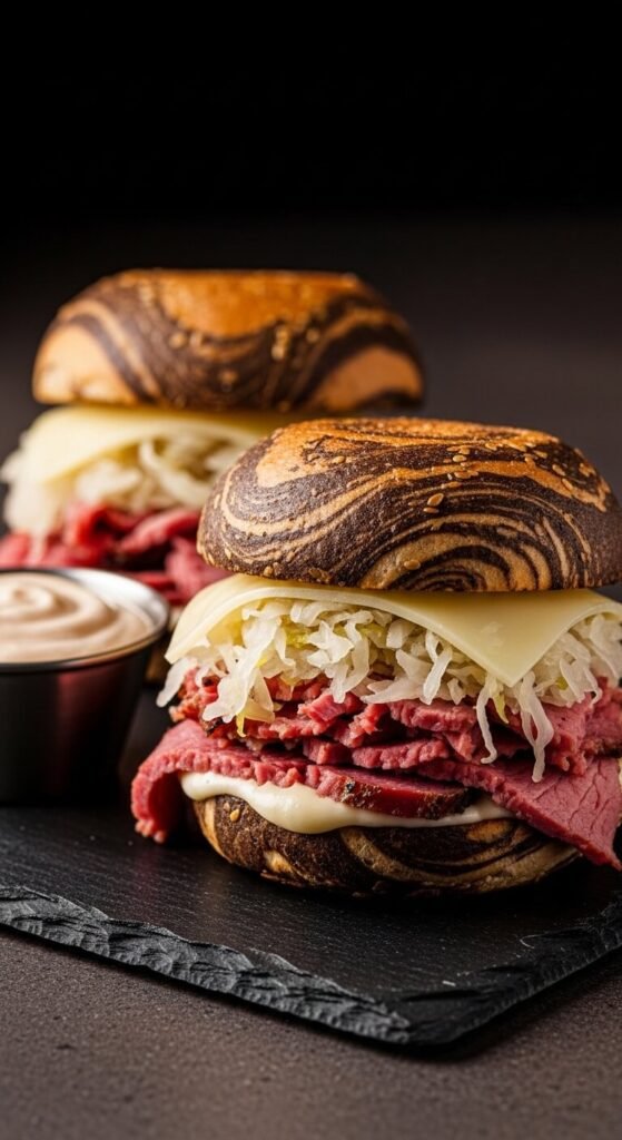 All the bold flavors of a deli Reuben — in two bites. Layer sliced corned beef, sauerkraut, and Swiss cheese on small rye or marble rye rolls. Spread Thousand Island dressing on the inside of each bun. Toast in the oven at 375°F for about 10 minutes until the cheese melts and the bread crisps. The sauerkraut adds tang and the corned beef delivers savory depth. These are outstanding for St. Patrick’s Day parties or any time you want deli-style flavor without standing in line.