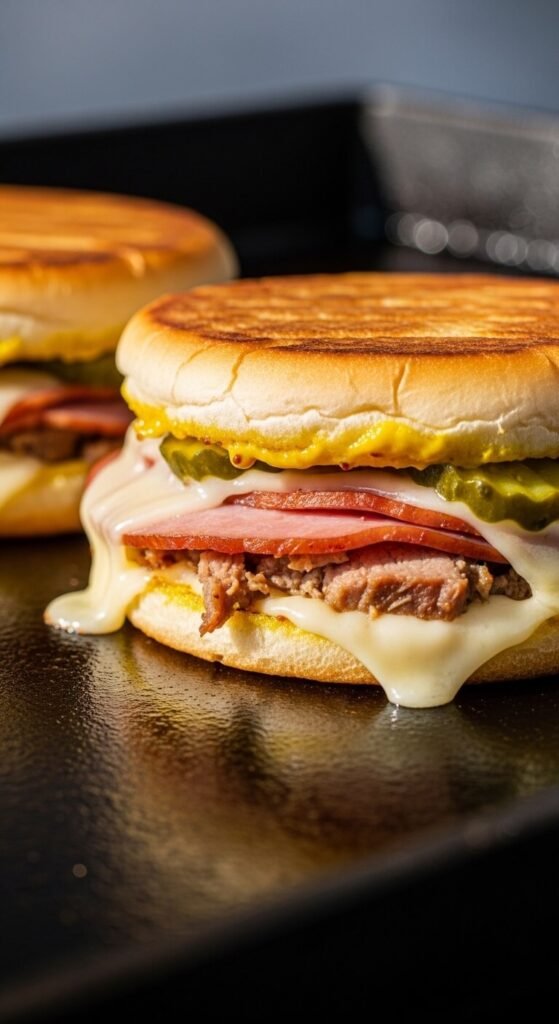 The classic Cuban sandwich — shrunk down to slider size. Layer sliced ham, slow-roasted pork, Swiss cheese, and dill pickles on a soft roll. Spread yellow mustard on both sides. Press the whole thing on a buttered griddle or panini press until golden and the cheese melts. The pressing step is key — it creates that crisp, slightly flattened exterior. Budget tip: use deli ham and pre-sliced pork from the grocery store. Quick, filling, and absolutely delicious.