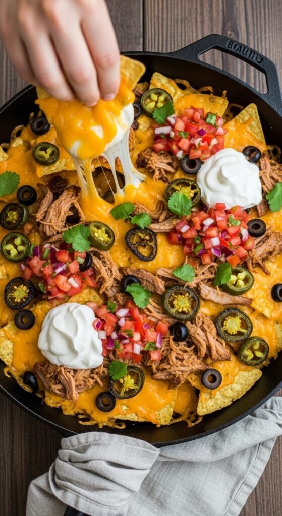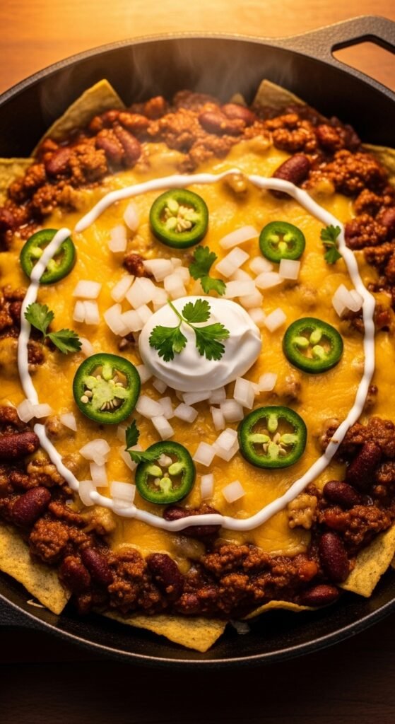 This is the one that started it all. Crispy tortilla chips, melted cheddar, jalapeños, and sour cream. It’s simple, affordable, and always works. Use a bag of restaurant-style chips for the best crunch. Layer cheese directly on the chips before baking — don’t just dump it on top. Bake at 375°F for 8–10 minutes until bubbly. Add cold toppings like guacamole and pico after baking. A can of black beans adds protein without breaking the budget. Feeds four people for under $10.
