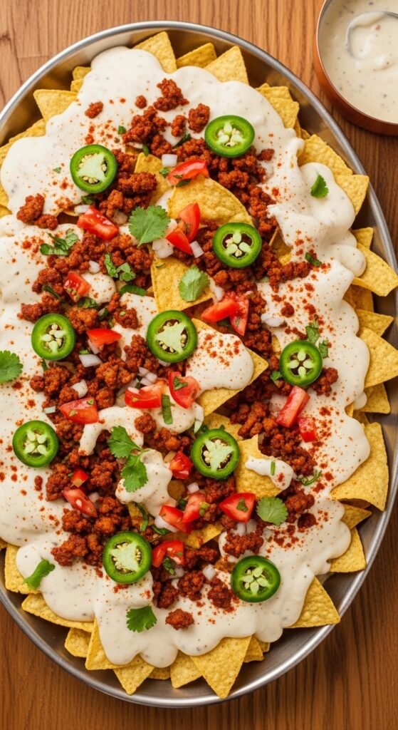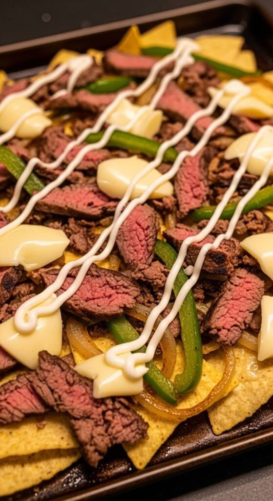 Use shaved ribeye (available frozen or from the butcher) and cook it fast in a hot pan with diced peppers and onions. Season simply — salt, pepper, and Worcestershire sauce. Layer over chips with provolone slices and bake until melted. For full authenticity, drizzle Cheez Whiz on top after baking. Yes, Cheez Whiz. It’s the traditional Philly way, and on nachos it adds a salty, creamy contrast to the provolone. This is a heavy, filling nacho tray. One batch easily feeds four people as a main dish.