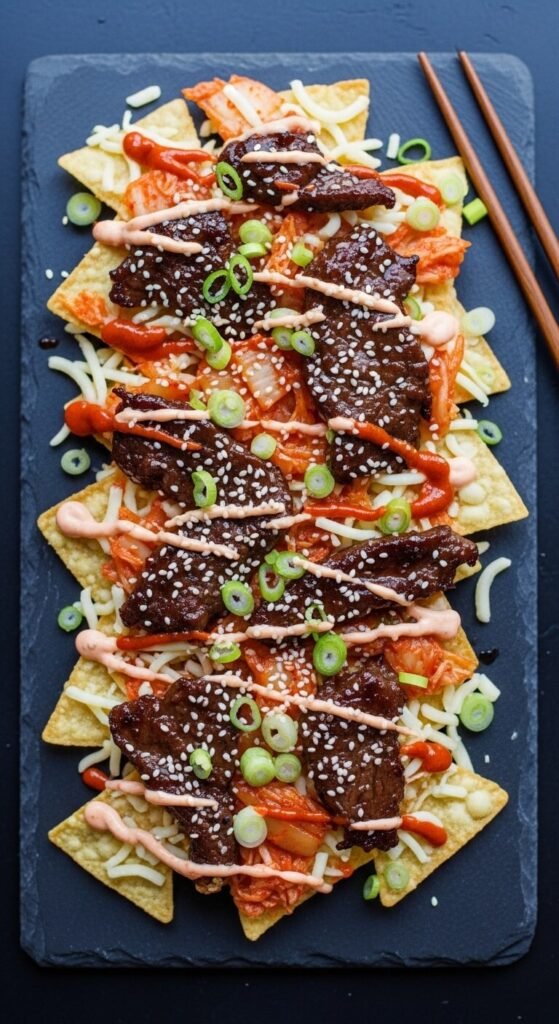 Fusion nachos done right. Bulgogi beef — thinly sliced ribeye marinated in soy sauce, sesame oil, garlic, and sugar — cooks in minutes in a hot pan. Pile over chips with mozzarella and bake. Top with kimchi, sliced green onions, sesame seeds, and a drizzle of sriracha mayo (just mix mayo with sriracha). You can buy pre-marinated bulgogi at most Asian grocery stores, making this surprisingly quick. The kimchi adds a tangy crunch that works incredibly well against the sweet caramelized beef.