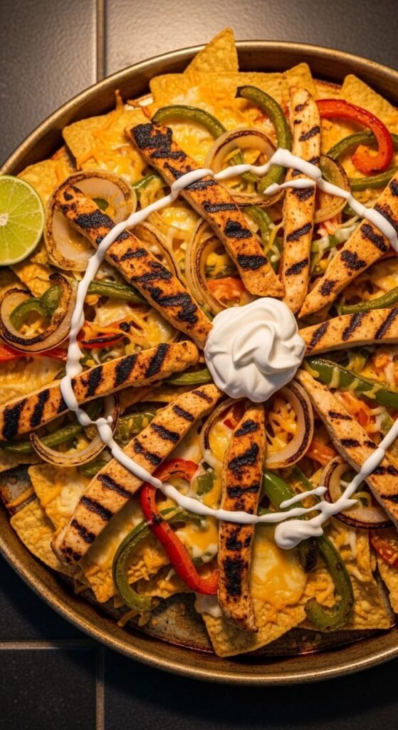 Cook chicken breast with sliced bell peppers and onions in a hot cast iron pan with fajita seasoning. Slice the chicken thin and layer everything over chips while still warm. Top with a cheddar-mozzarella blend and bake at 375°F until the cheese is fully melted and the chip edges are crispy. Add sour cream after baking and squeeze fresh lime over the whole tray. Fajita seasoning packets cost about $1 and do all the flavor work. This is a great dinner-sized nacho that feeds a family of four.
