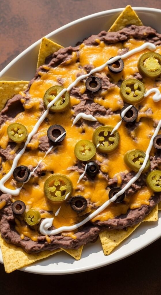 Spread canned refried beans directly onto chips before adding cheese — this creates a stickier, more loaded bite that holds everything together. Use black or pinto refried beans and season with cumin and garlic powder if they need flavor. Cover with cheddar and bake until melted. Top with pickled jalapeños, black olives, and a drizzle of Mexican crema. This is a very affordable base recipe. A can of refried beans costs about $1.50 and makes enough for a full tray. Add any protein on top to make it more filling.