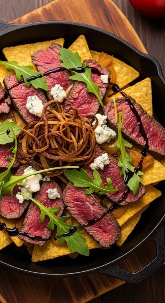 Pan-sear a ribeye or strip steak to medium-rare, rest it, then slice thin. Pile the sliced steak over chips, add crumbled blue cheese, and broil just until the cheese softens. Top with caramelized onions and a small handful of arugula. The heat from the chips wilts the arugula slightly. Finish with a thin drizzle of balsamic glaze. This is the steakhouse nacho. It works best as a date-night appetizer or a special occasion snack. One 8-oz steak covers a full tray and costs about $10–12.