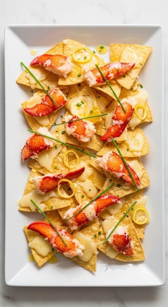 Save this one for when you want to impress. Buy lobster tails on sale (they frequently go on sale at grocery stores) and poach them gently in salted water for 5–6 minutes. Remove the meat, chop into chunks, and layer over chips with Gruyère cheese. Broil just until the cheese melts — don’t over-bake or the lobster toughens. Drizzle with drawn butter and finish with fresh chives and lemon zest. Two small lobster tails are usually enough for a tray. This is restaurant-quality for a fraction of the cost of going out.