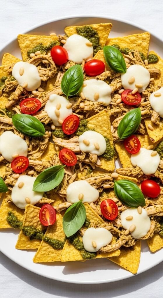 Toss shredded rotisserie chicken in jarred basil pesto — about 3 tablespoons is enough for one cup of chicken. Spread pesto chicken over chips, cover with shredded mozzarella, and bake at 375°F for 8 minutes. Top with halved cherry tomatoes, a few pine nuts, and fresh basil leaves. The result is an Italian-leaning nacho that’s lighter and brighter than the typical heavy cheese versions. Jarred pesto costs about $4 and does all the flavor heavy lifting. A great option when you want something a little different from the usual Tex-Mex direction.