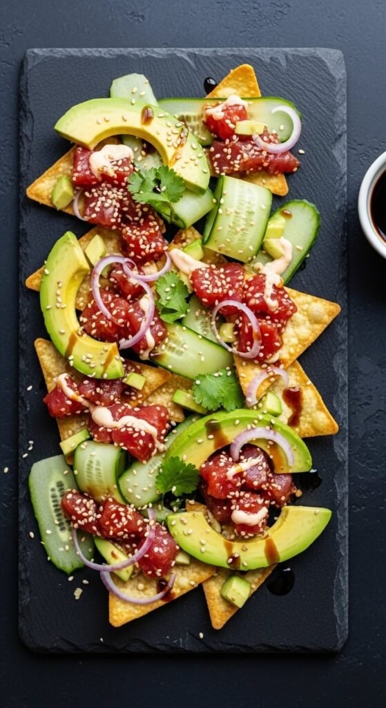 Use sushi-grade tuna from a trusted fishmonger or grocery store seafood counter. Dice it small and toss with sriracha mayo, a few drops of sesame oil, and soy sauce. Pile cold over wonton chips or light tortilla chips. Add thin avocado slices, cucumber ribbons, and sesame seeds. Drizzle with a little soy sauce or eel sauce for sweetness. This is a no-bake, cold-assembled nacho that looks stunning on a plate. It’s popular at trendy restaurants but very easy to recreate at home for a fraction of the price. Serve immediately.