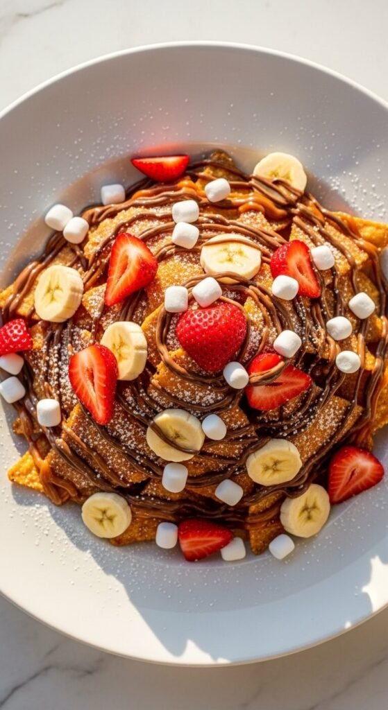 Cut flour tortillas into triangles, brush with melted butter, and coat in cinnamon sugar. Bake at 375°F for 8–10 minutes until crispy and golden. Arrange on a plate and drizzle with melted chocolate and warm caramel sauce. Top with sliced strawberries, banana, and mini marshmallows. This is a dessert, a party snack, and a kid-friendly activity all in one. Dip the chips in the drizzled sauce or eat them loaded as-is. Cost to make: under $6. It’s the perfect way to end a nacho night when you want something sweet without a lot of effort.