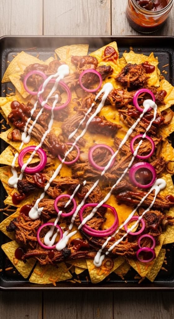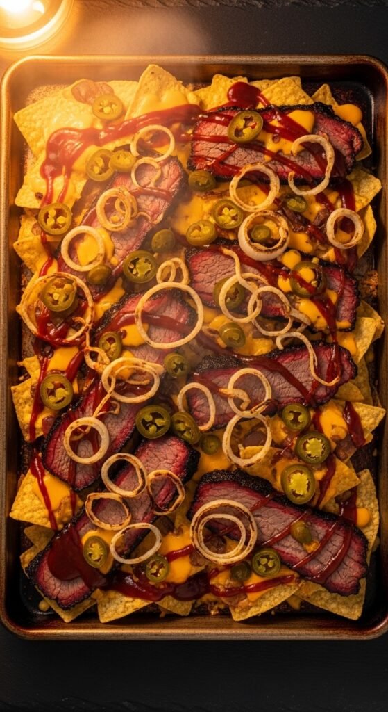 If you have access to brisket — from a cookout, a BBQ joint, or even the grocery store deli — turn it into nachos immediately. Slice or chop the brisket into small chunks. Layer over chips with cheddar and caramelized onions. Bake until the cheese bubbles and the edges of the chips go golden. Drizzle generously with thick BBQ sauce after baking. These are messy, heavy, and absolutely worth every bite. Brisket from a BBQ restaurant makes this effortless — just pick up a half-pound and you’re set.