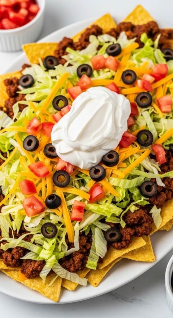 Season ground beef with a taco packet and you’ve got the base for an unbeatable nacho tray. Brown one pound of beef, drain the fat, and add the seasoning with a splash of water. Layer chips, then beef, then a heavy amount of cheddar. Bake until melted. Add cold toppings after: shredded lettuce, diced tomato, sour cream, and olives. It tastes like a taco in nacho form. Ground beef costs under $5 per pound at most stores, making this one of the most budget-friendly options on this list.